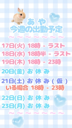 おはようございます ☀️ あやさんです 🎀🤍先週は沢山ありがとうございました ❕あやさんの患者様、水曜日以外毎日来てくれて嬉しすぎました …😭😭😭😭🙏🏻❕✨️ また次のブログで先週のお礼もするのですが、取り急ぎ今週の出勤予定 ❕❕❕⬇️( 患者様は絶対みて ) ━━━━━━━━━━━━━━━画像にもある通りなのですが🎀 🟰 確実にいる日🥹🟰 悩み中💭😭🟰 絶対に居ない日 🎀 火曜日(今日‼️) 18時 - ラスト🎀 水曜日 18時半 - ラスト🎀 木曜日 18時 - 23時😭 金曜日 居ません‼️🙅🏻♀️❌🥹 土曜日 今のところは居ない予定‼️🙅🏻♀️❌💡 居た場合は 18時 - 23時 💡( ⬆️ 事前予約くれたら必ず行きます )日曜日 居ません‼️🙅🏻♀️❌😭 月曜日 居ません‼️🙅🏻♀️❌ ━━━━━━━━━━━━━━━ 祝日のお休みの時だから…まだ悩んでるんだけど、今週ほとんど居ないと思うのでお気をつけて 😣把握お願いいたします 🙇🏻♀️🙇🏻♀️💦‼️ 特になんかあった訳では無くて予定が詰め詰めでそのタイミングで連休取るか悩んでるってだけだよ~ 🥹 あやさんは、一応社畜脳なので…連休取りたい気持ちと出勤した方がいいかという気持ちでおろおろしてます ( '-' ) クリニックは好きに休ませてくれるのに私が私自身を好きに休ませられないという ( '-' )良くないね~たまには休んでもええやんね 🙂↕️💧 今週は少しだけにはなりますが、ご来院お待ちしてます 🫶🏻それでは、またまた 🖐🏻🤍 ━━━━━━━━━━━━━━━